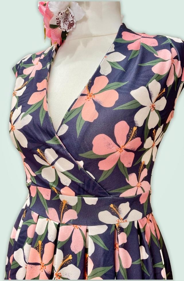 Robe retro, décolleté V cache coeur, bleue marine à fleurs, Lady Vintage